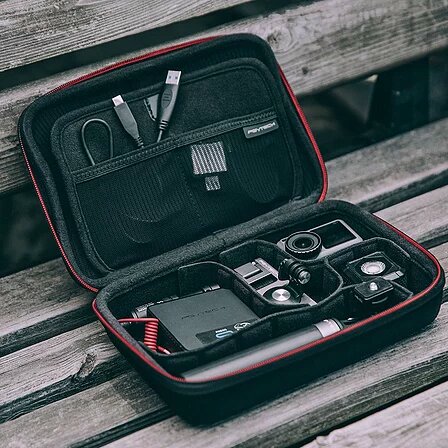 Может вместить Osmo Action и несколько аксессуаров. Он включает в себя два длинных и четыре коротких складных перегородки, которые помогают организовать область хранения. Сумка покрыта прочной водонепроницаемой оболочкой из нейлоновой ткани.